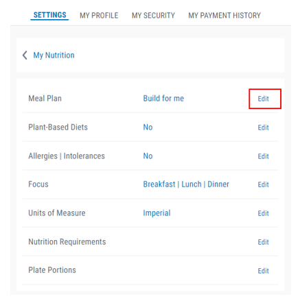6. Select the Edit button next to Meal Plan
