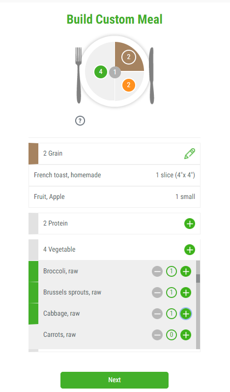 Absolutely! After expanding the dropdown for a food group, click the ⨁ (Add icon) beside an ingredient to add one or more servings to the meal (depending on the requirement for that food group in the meal). Continue choosing a variety of foods until all of your servings are used up. For example, if you need 4 servings of vegetables for your lunch plate, you could have 1 serving each of 4 different vegetables or 4 servings of 1 vegetable. It's completely up to you!