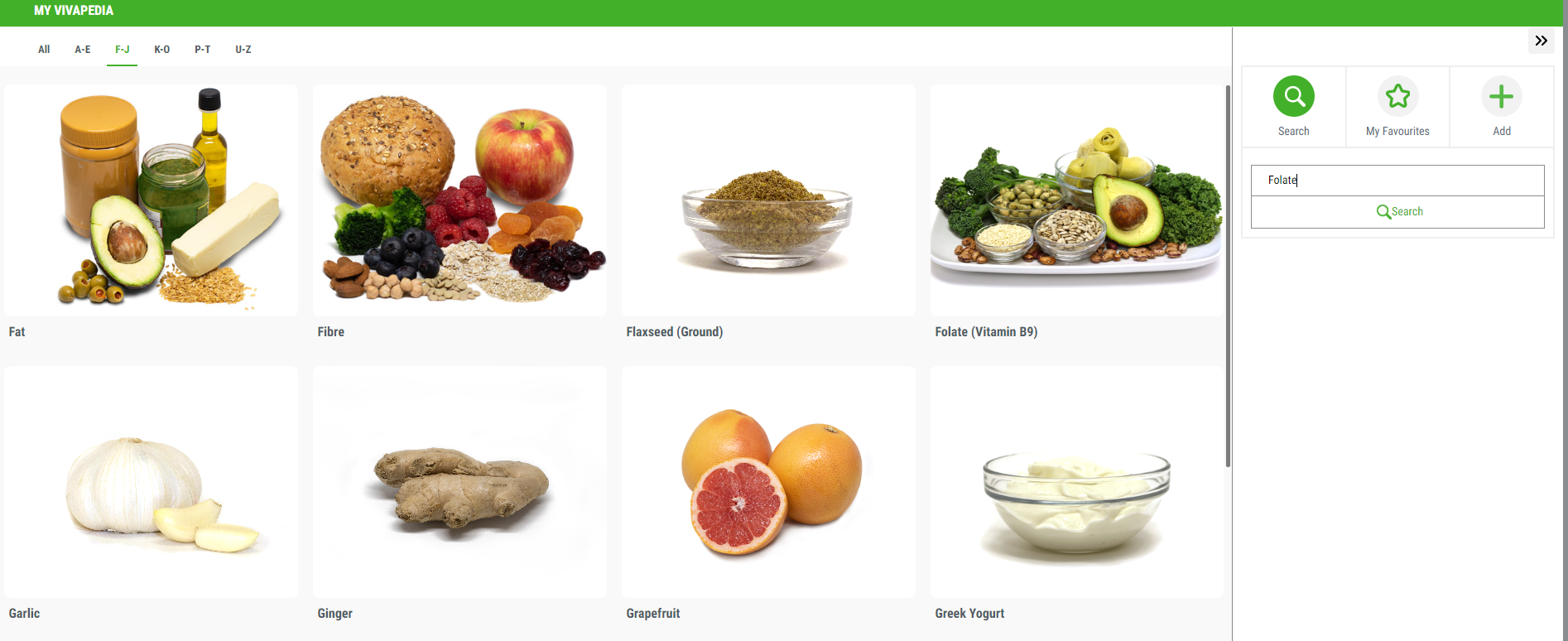 Utilize the search bar to look for specific food or nutrients. Each Vivapedia contains recipe links to help incorporate these foods or nutrients into your meals.