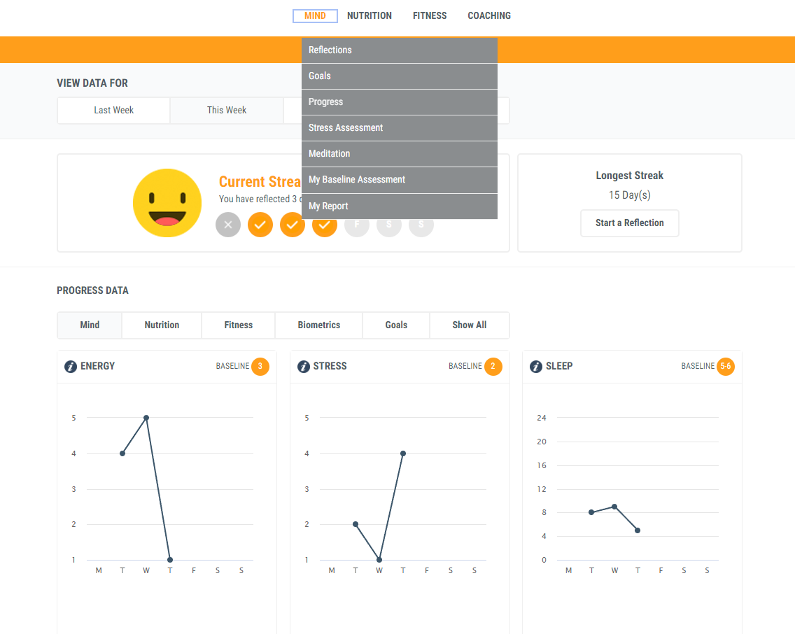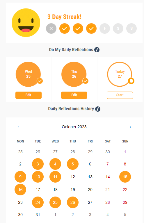 Note: If the date is highlighted in orange, you completed a Reflection for that day and can view it. If the date is not highlighted in orange, you did not complete a Reflection that day and no data will be available to view.