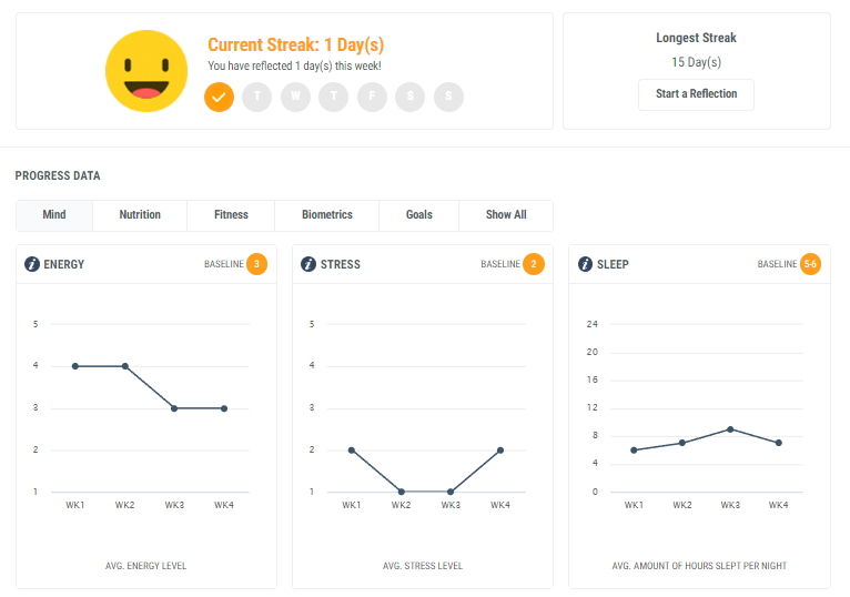 The Progress section is a collection of your unique data compiled over the week, month, or year as a tool for you to visualize any trends in your nutrition, fitness, sleep, stress, and mental health.